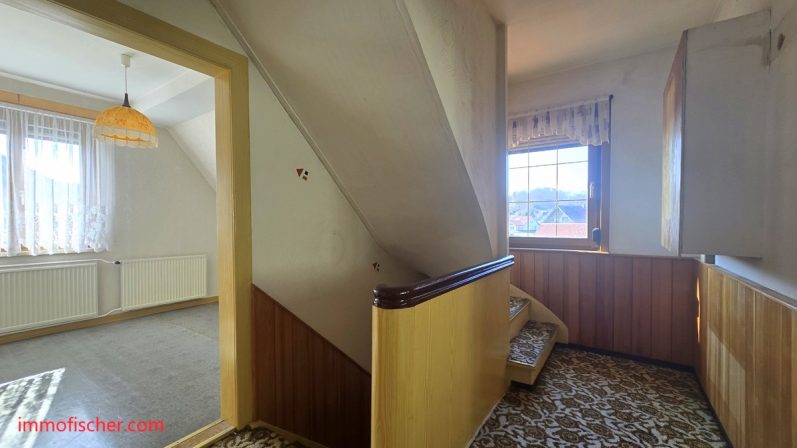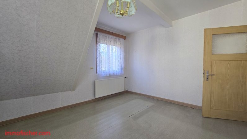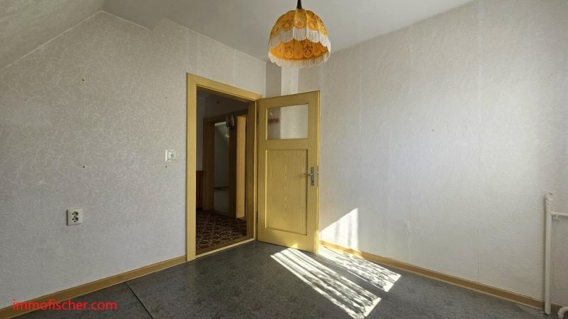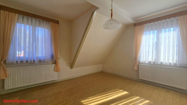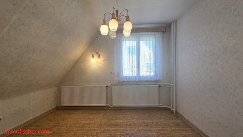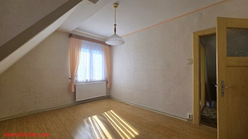 Das Einfamilienhaus wurde um 1940 in massiver Bauweise errichtet und 1993 um einen Garagenanbau auf der Südwestseite erweitert. Es verfügt über eine zweckmäßige Raumaufteilung und bietet mit seinen sechs Zimmern, der Küche und einem Bad ausreichend Platz. Im Dachboden ist eine Ausbaureserve vorhanden. Vor einem Neubezug sind Modernisierungen in den Gewerken Elektro, Sanitär/Heizung sowie im Innenausbau notwendig. Besonders interessent ist die große Garage mit der darauf befindlichen Sonnenterrasse. Das gut geschnittene und ebene Grundstück bietet viele Möglichkeiten zur aktiven Freizeitgestaltung und Erholung.