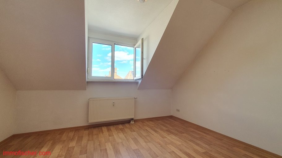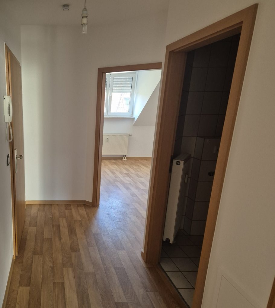 Die besonders helle Eigentumswohnung befindet sich im Dachgeschoß einer 1996 errichteten, gepflegten Eigentumswohnanlage auf der Ostseite der Stadt. Sie verfügt über eine moderne Raumaufteilung mit einem Wohnzimmer und offener Küche, einem Flur, einem Schlafzimmer sowie einem Bad mit Wanne und WC. Ein Abstellraum ist in der Wohnung und im Keller vorhanden. Die Wohnung ist mit einer modernen Einbauküche ausgestattet.
