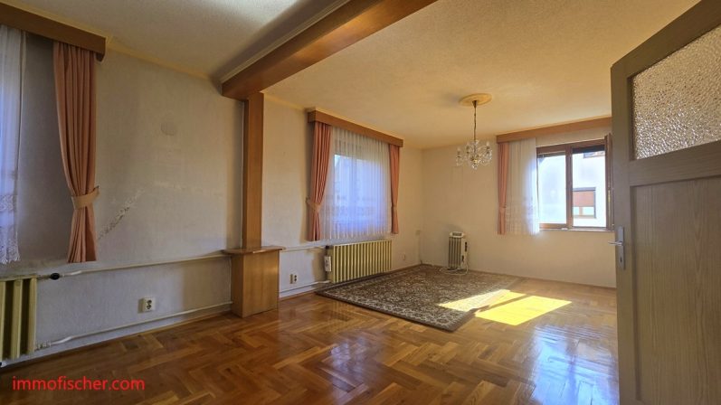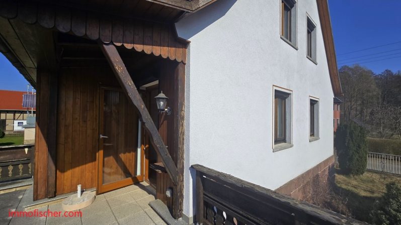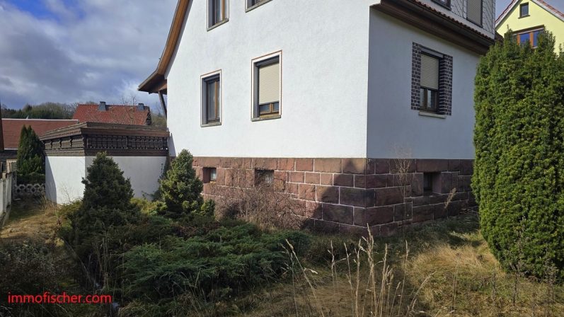 Das Einfamilienhaus wurde um 1940 in massiver Bauweise errichtet und 1993 um einen Garagenanbau auf der Südwestseite erweitert. Es verfügt über eine zweckmäßige Raumaufteilung und bietet mit seinen sechs Zimmern, der Küche und einem Bad ausreichend Platz. Im Dachboden ist eine Ausbaureserve vorhanden. Vor einem Neubezug sind Modernisierungen in den Gewerken Elektro, Sanitär/Heizung sowie im Innenausbau notwendig. Besonders interessent ist die große Garage mit der darauf befindlichen Sonnenterrasse. Das gut geschnittene und ebene Grundstück bietet viele Möglichkeiten zur aktiven Freizeitgestaltung und Erholung.