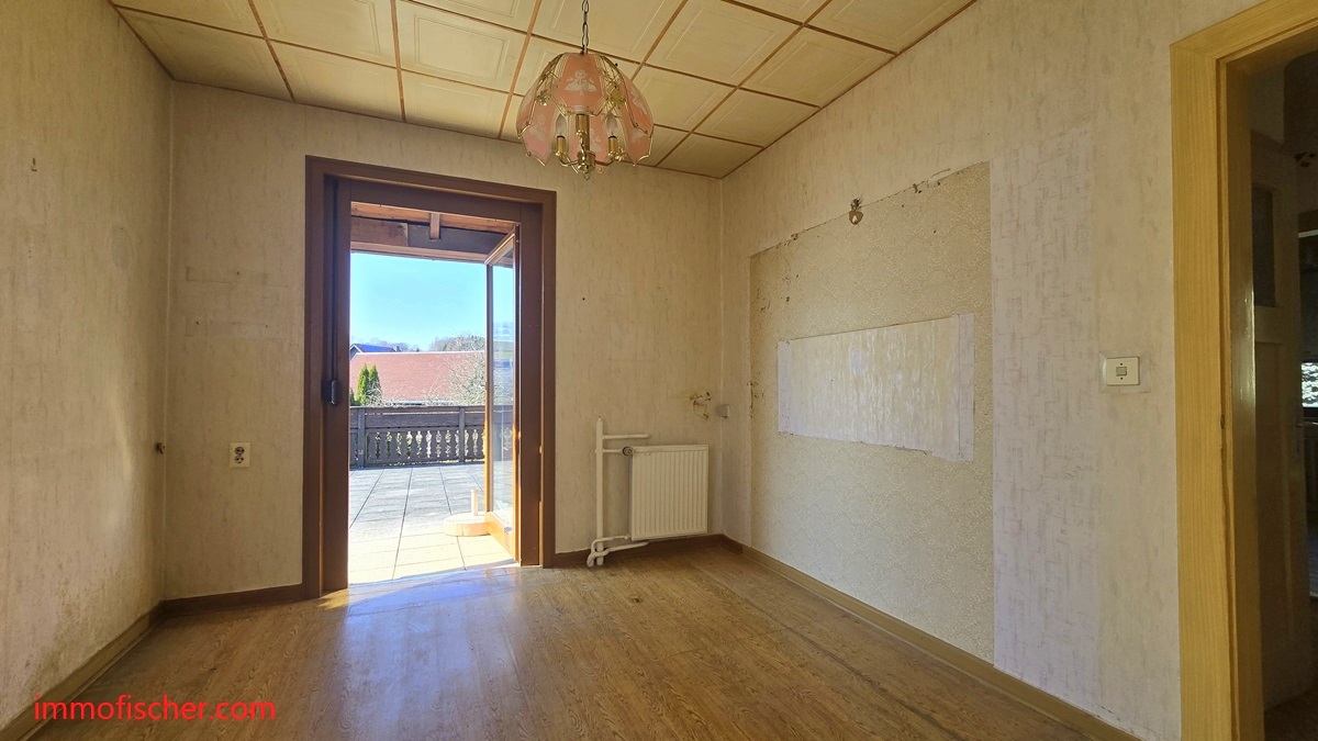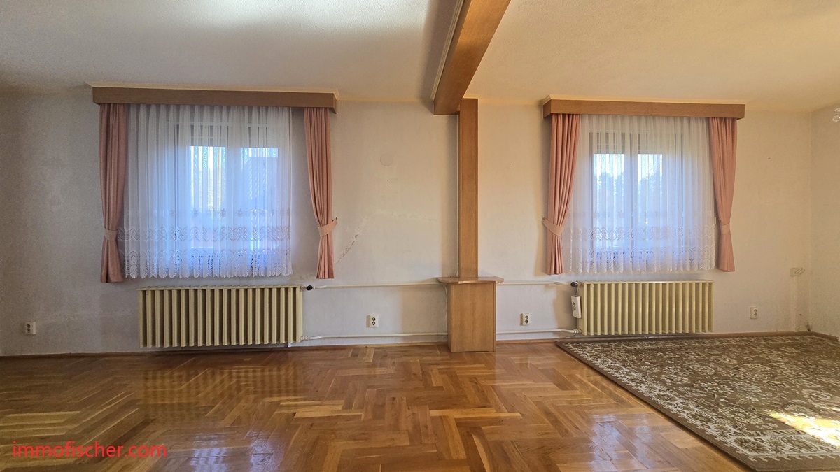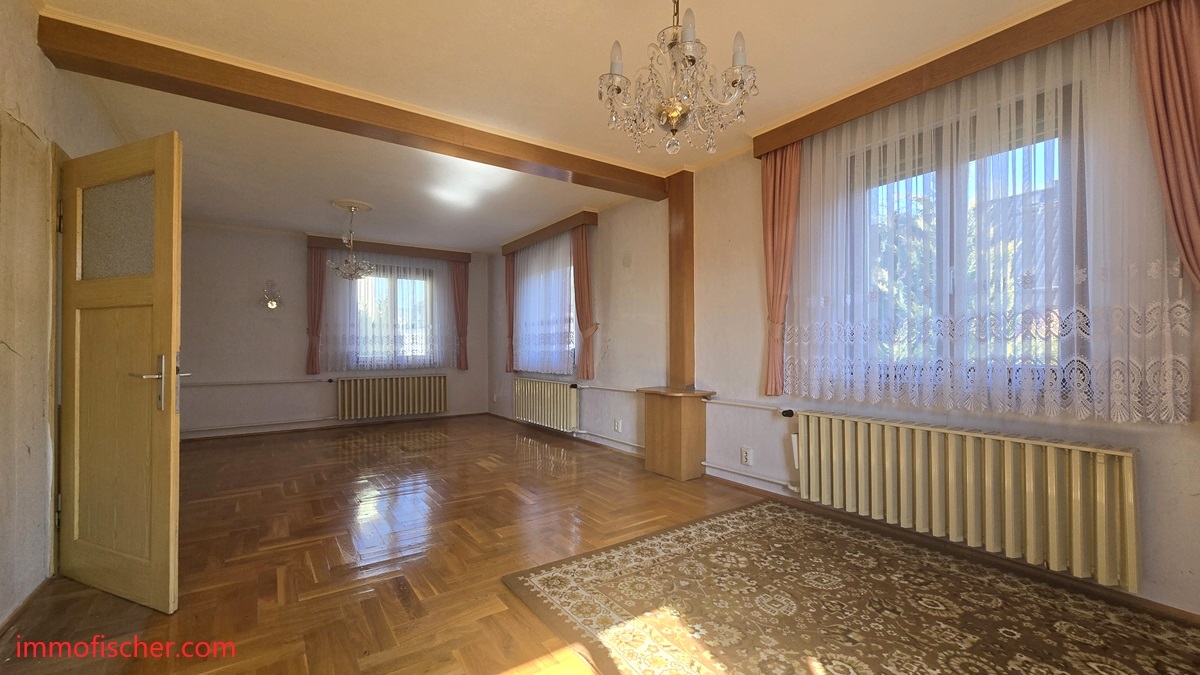 Das Einfamilienhaus wurde um 1940 in massiver Bauweise errichtet und 1993 um einen Garagenanbau auf der Südwestseite erweitert. Es verfügt über eine zweckmäßige Raumaufteilung und bietet mit seinen sechs Zimmern, der Küche und einem Bad ausreichend Platz. Im Dachboden ist eine Ausbaureserve vorhanden. Vor einem Neubezug sind Modernisierungen in den Gewerken Elektro, Sanitär/Heizung sowie im Innenausbau notwendig. Besonders interessent ist die große Garage mit der darauf befindlichen Sonnenterrasse. Das gut geschnittene und ebene Grundstück bietet viele Möglichkeiten zur aktiven Freizeitgestaltung und Erholung.
