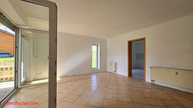 Die helle Wohnung befindet sich im Erdgeschoß eines kleinen Mehrfamilienhauses. Sie verfügt über eine moderne Raumaufteilung mit einem großen Wohnzimmer mit Terrasse, einem Schlaf-, einem Kinderzimmer, einem großen Tageslichtbad mit Wanne sowie einer Wohnküche. Ein Abstellraum ist sowohl in der Wohnung, als auch im Keller vorhanden. Die Wohnung steht bereits leer und ist somit auch für Eigennutzer interessant. Vor einem Neubezug ist eine Renovierung der Wohnung erforderlich. Interessant ist die ebene und überdachte Terrasse auf der Südwestseite. Zur Wohnung gehören zwei Kfz-Stellplätze.